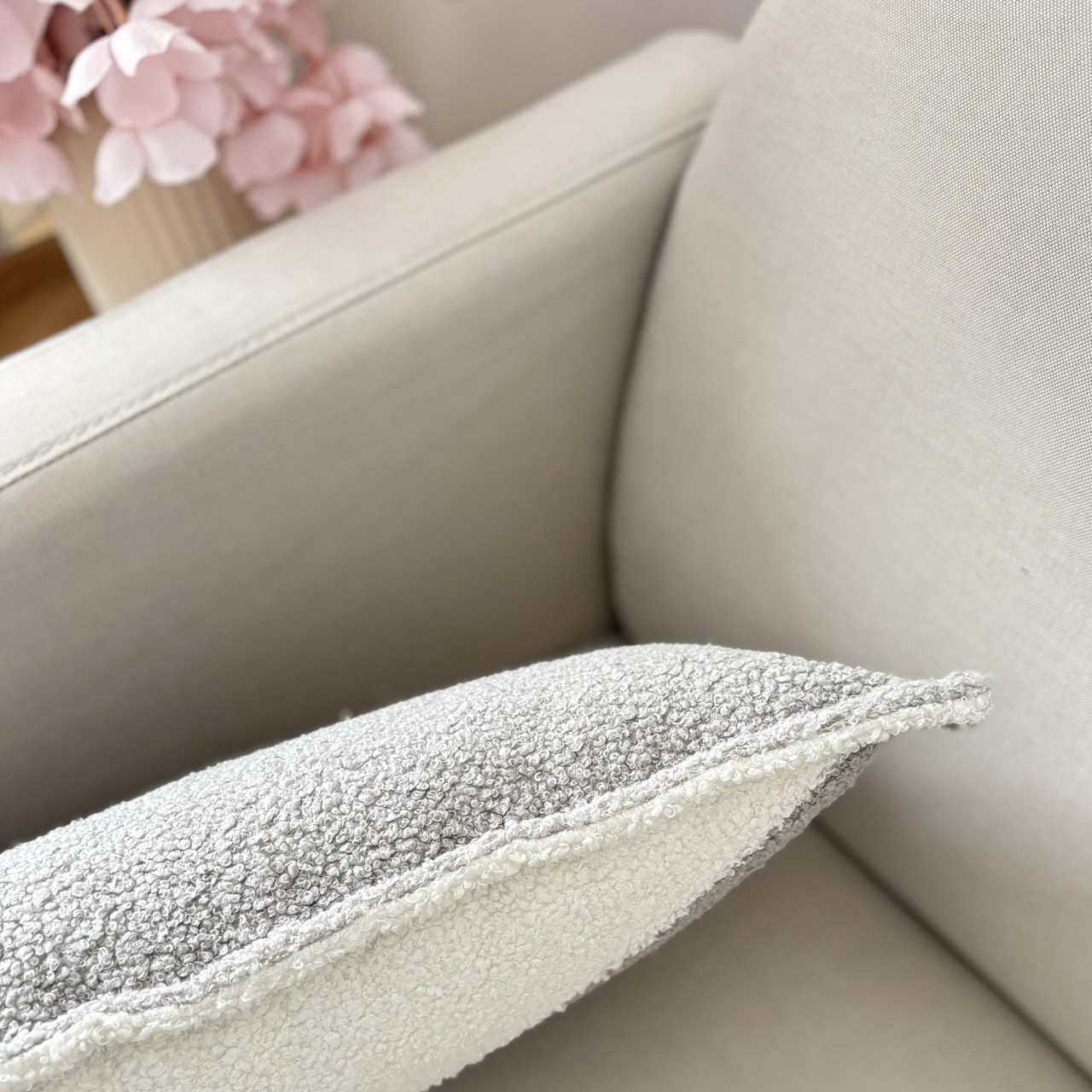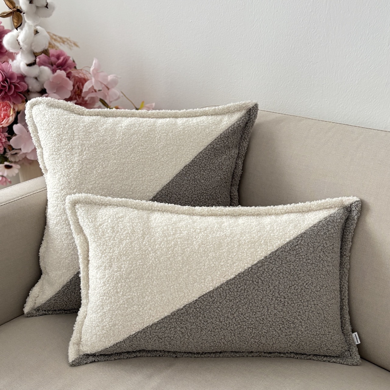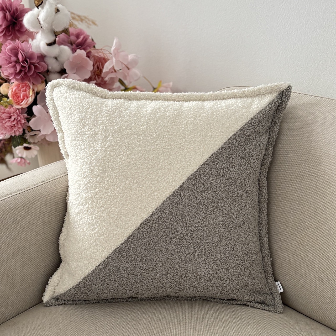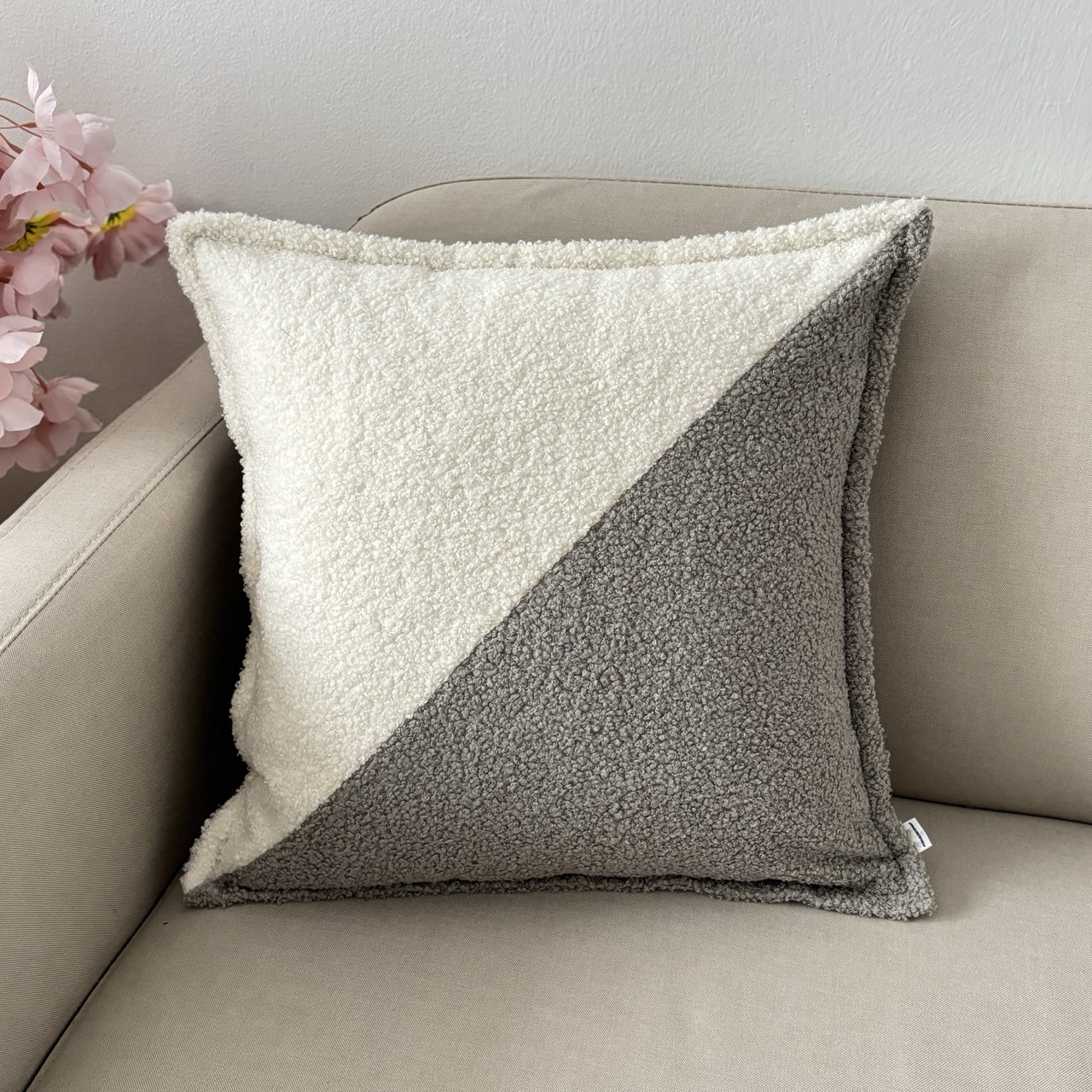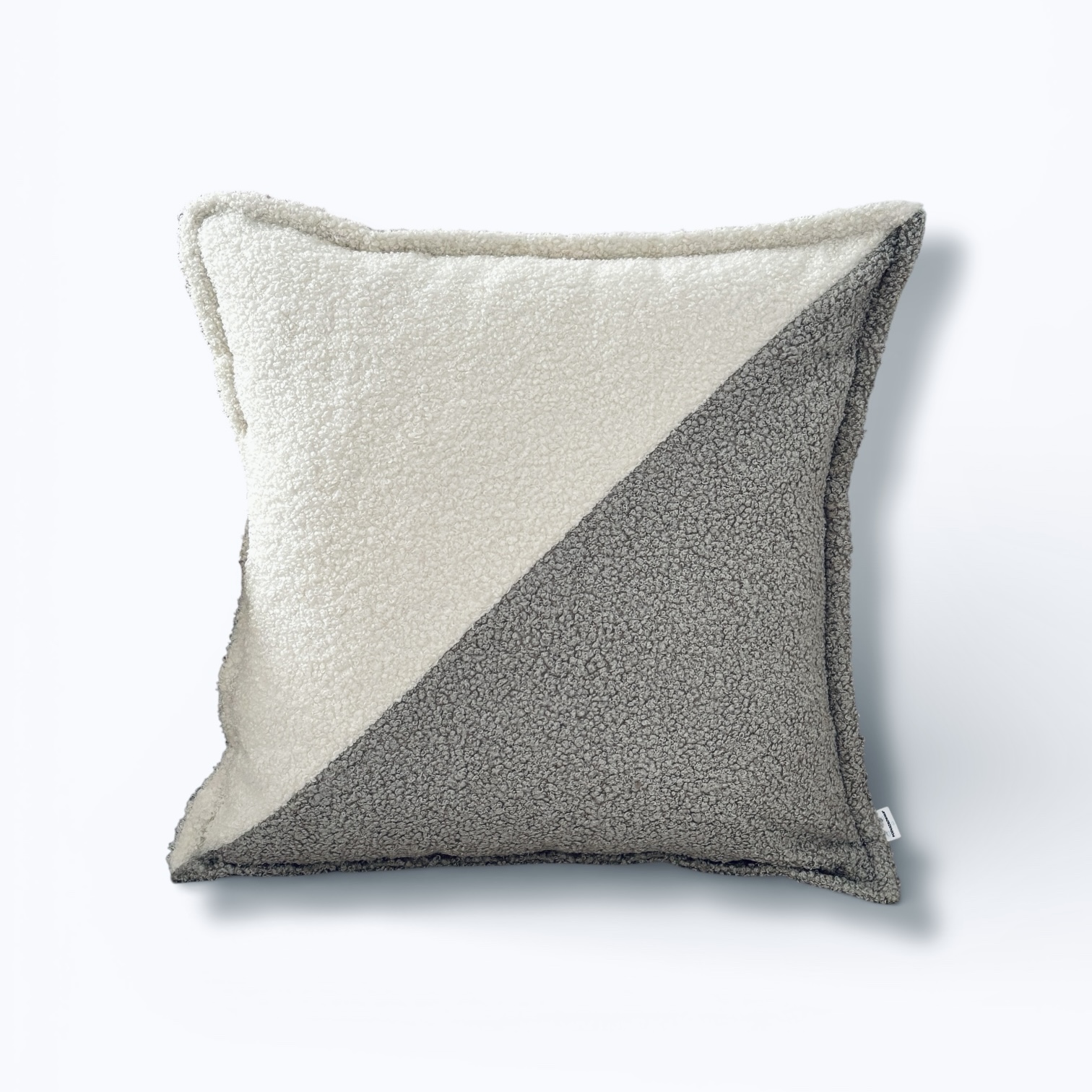 Poduszka dekoracyjna kwadrat boucle dwukolorowa ecru–jasny szary, skośny wzór