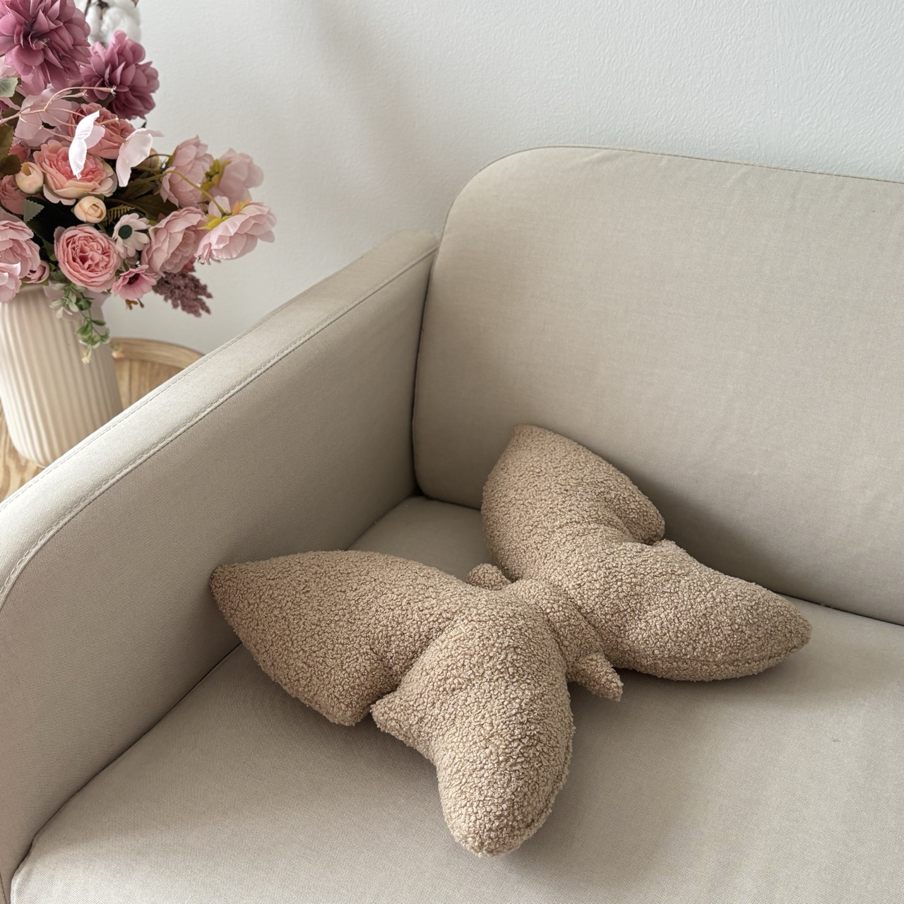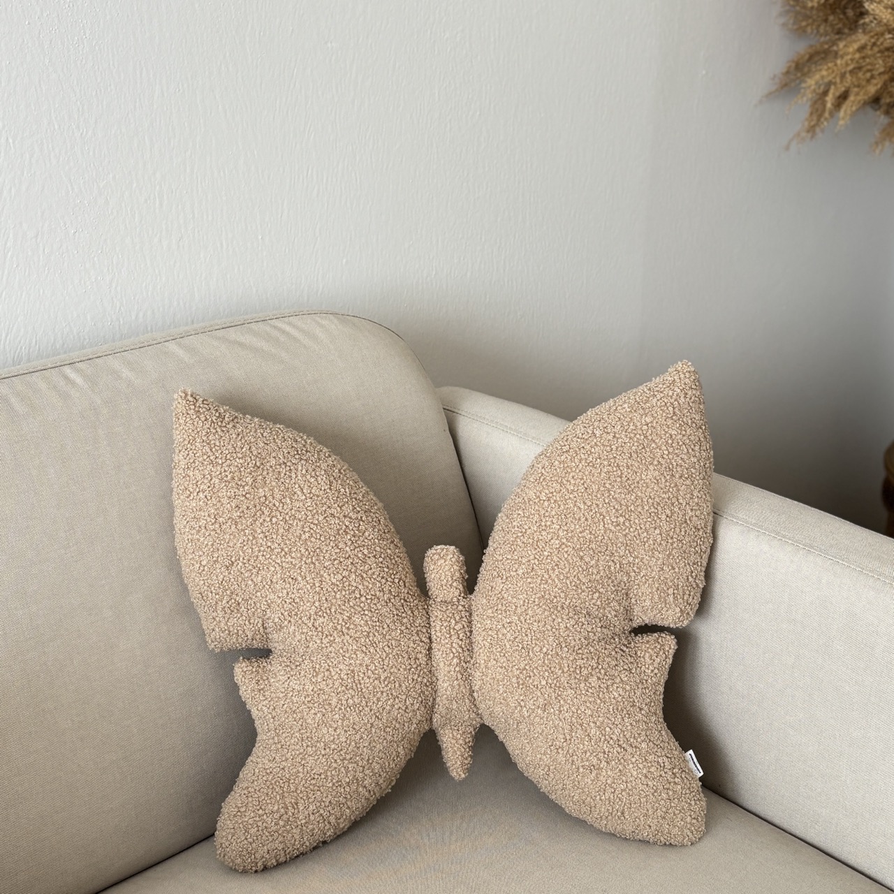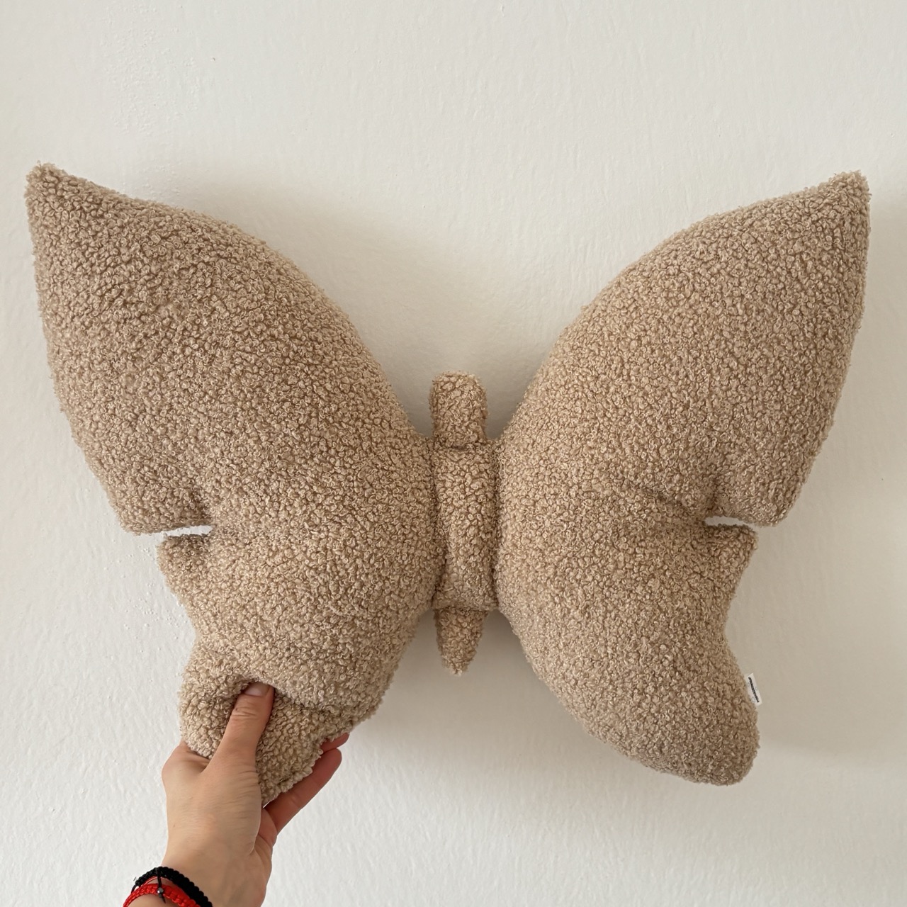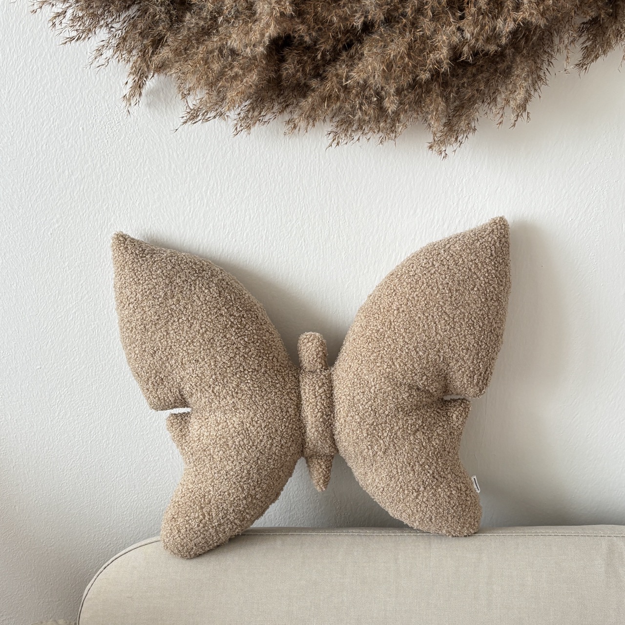 Poduszka wykonana z tkaniny boucle „baranka”. Zachwyca swoją minimalistyczną formą inspirowaną kształtem motyla oraz unikalną, przyjemną w dotyku teksturą.