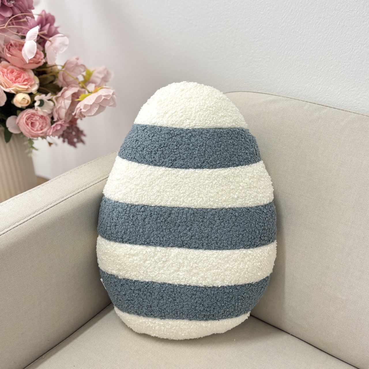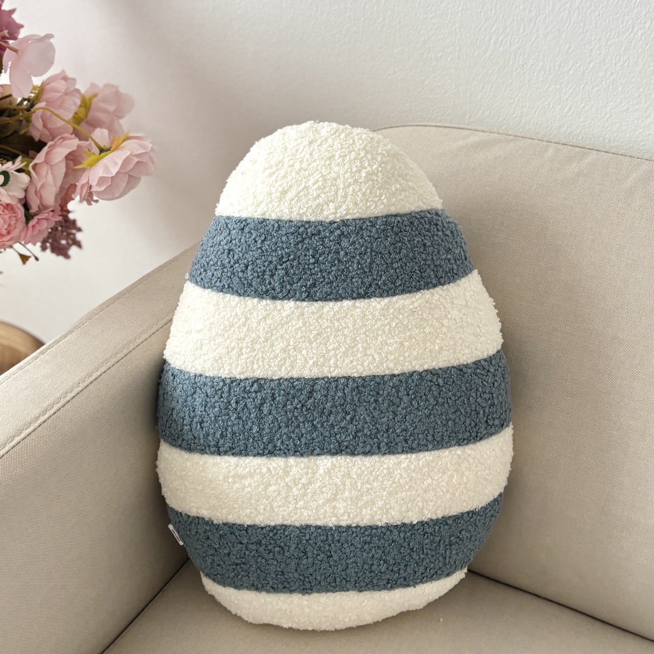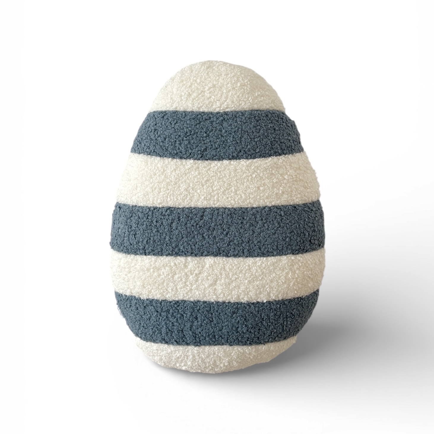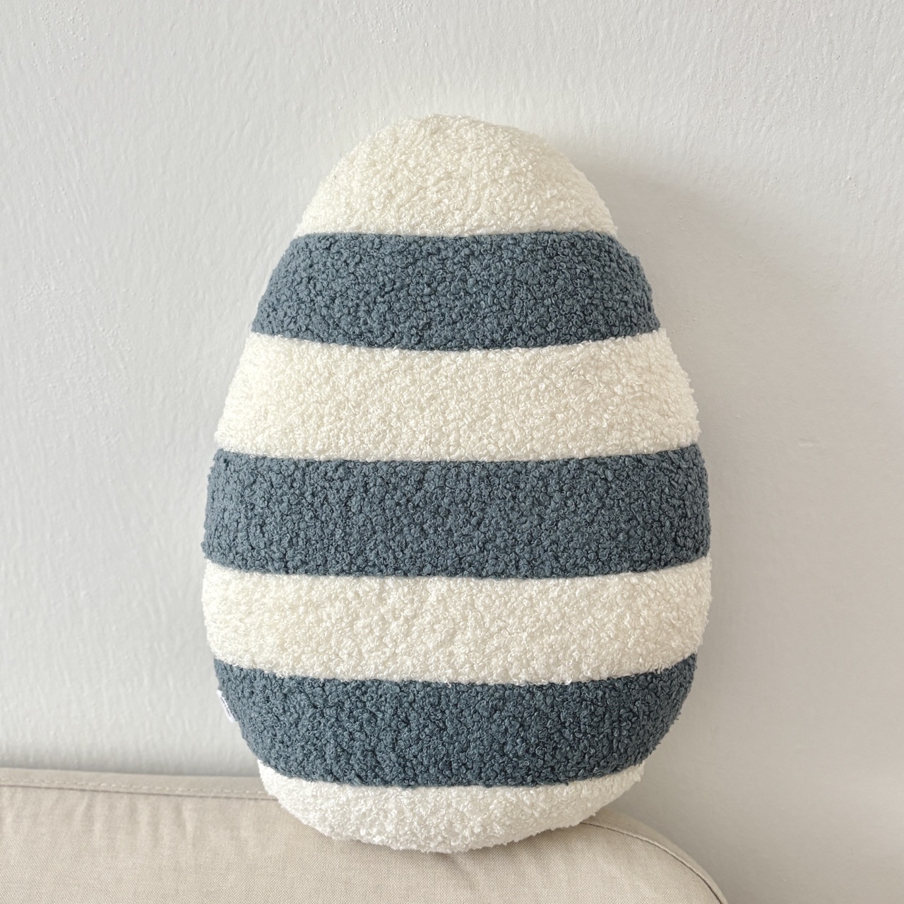 Poduszka w kształcie Jajka pisanki boucle w paski niebieskie (zgaszony odcień) i ecru (ciepły biały)