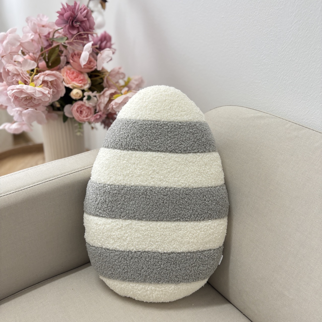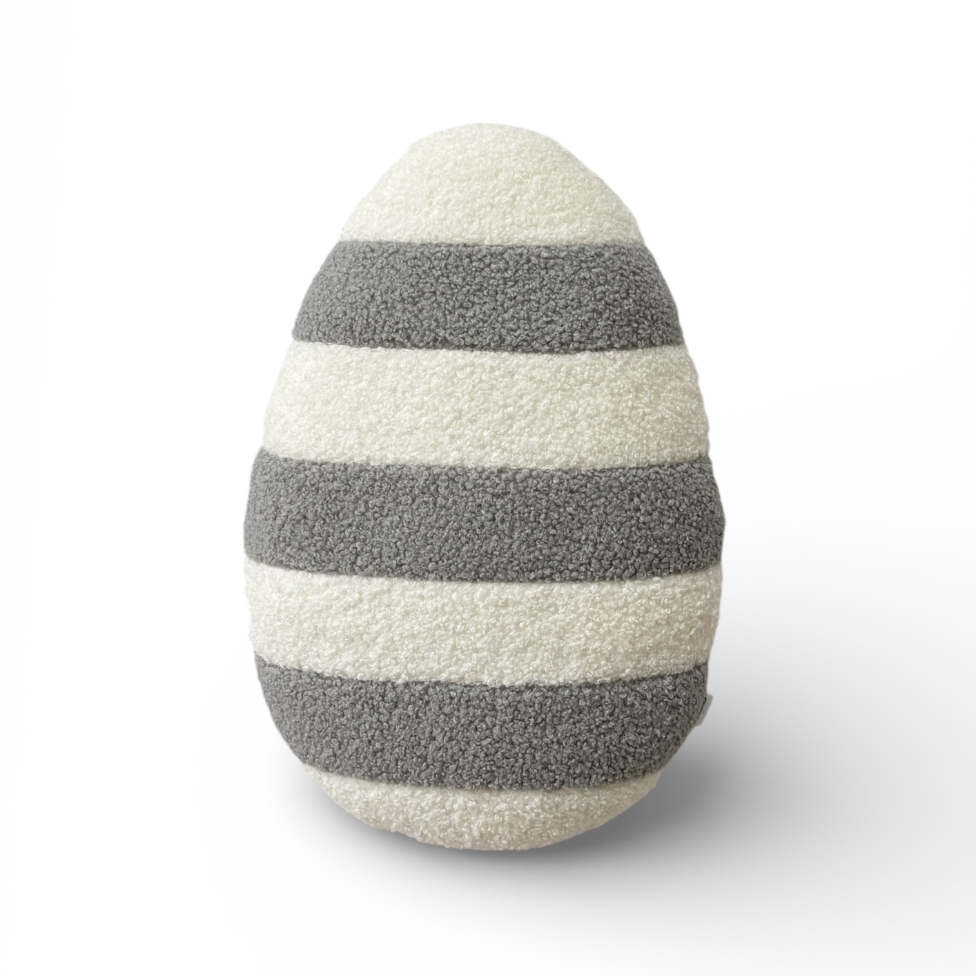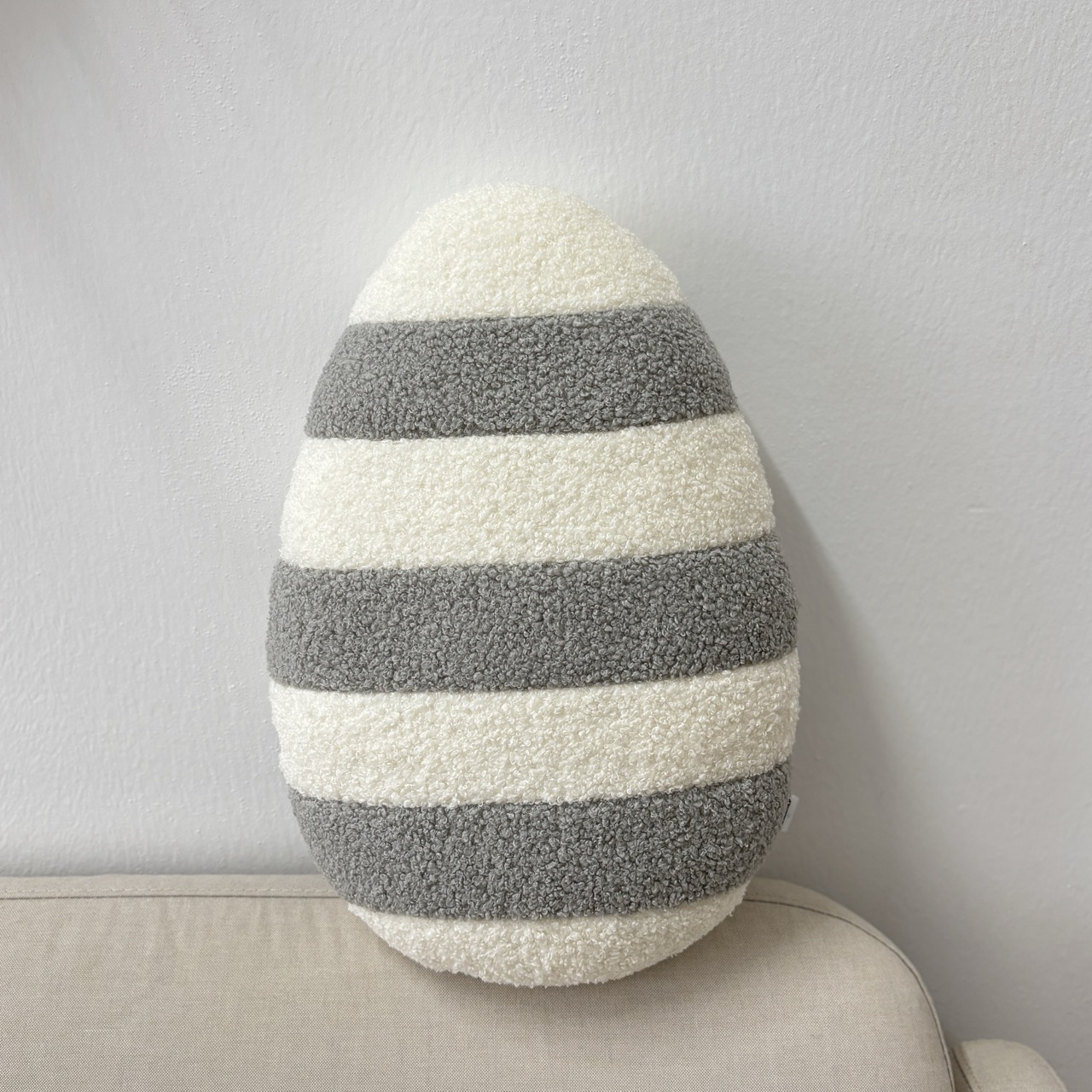 Poduszka w kształcie Jajka pisanki boucle w paski jasny szary i ecru (ciepły biały)