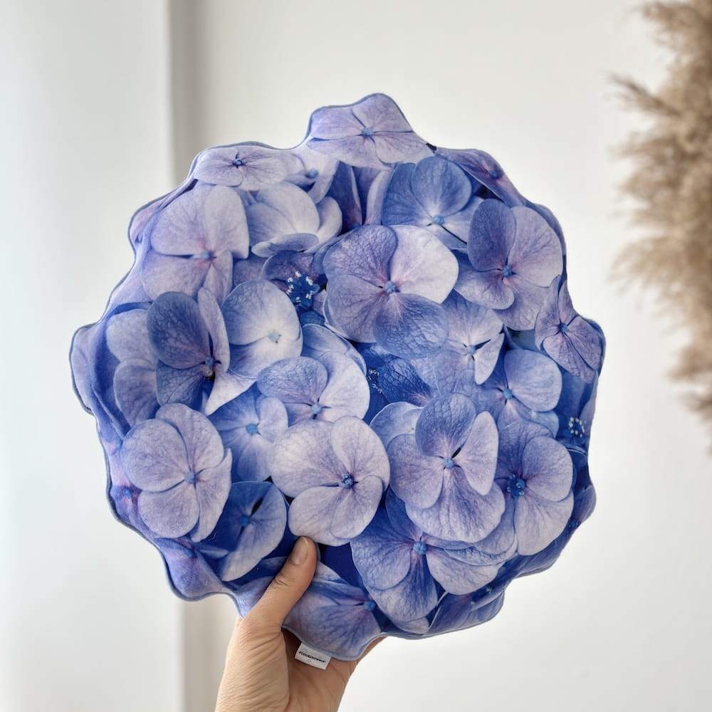 Poduszka kwiat Hortensja Hydrangea macrophylla w pięknym kolorze wpadającym w fioletowo-niebieski odcień z odrobiną lekkiego różu, to zachwycająca dekoracja obok której nie można przejść obojętnie.