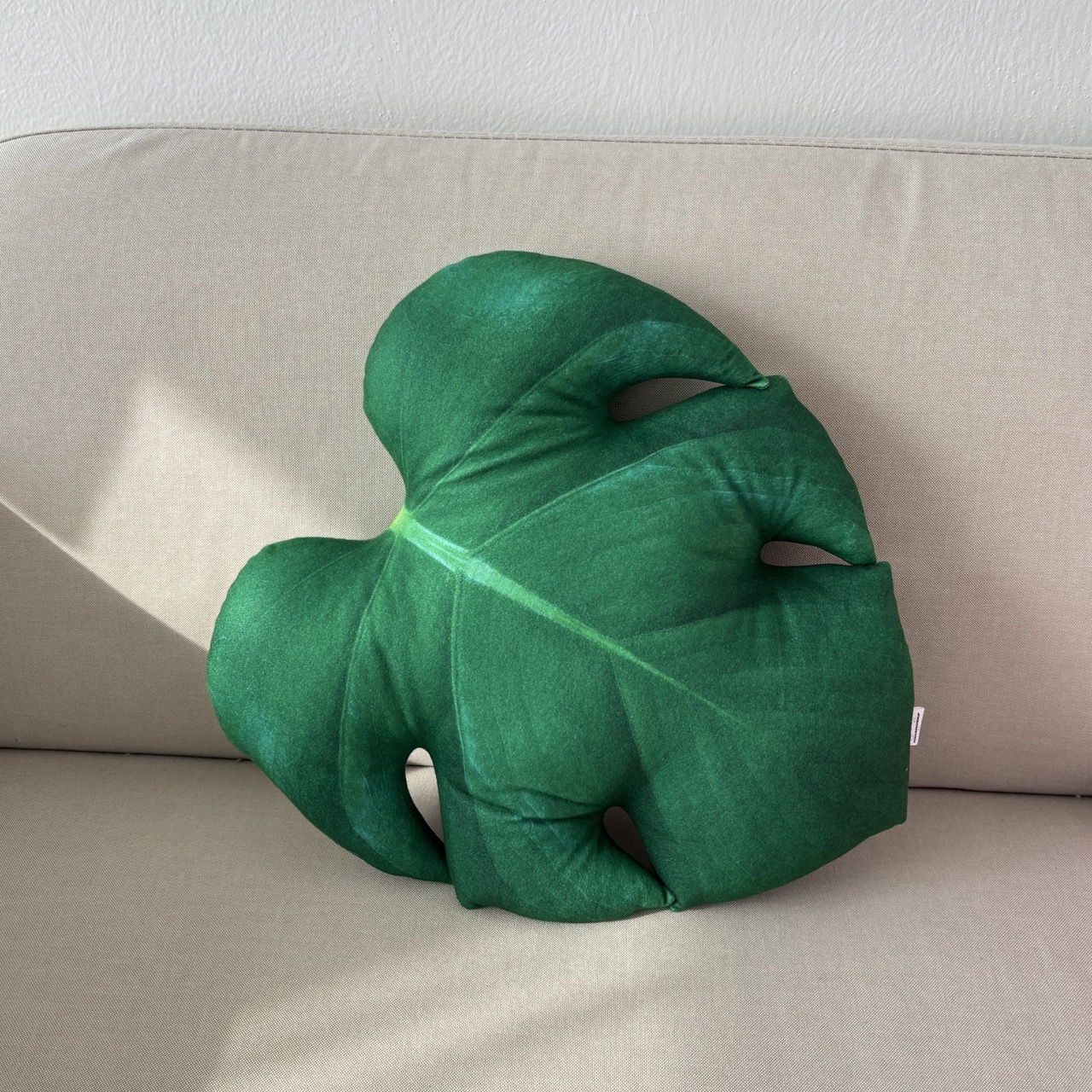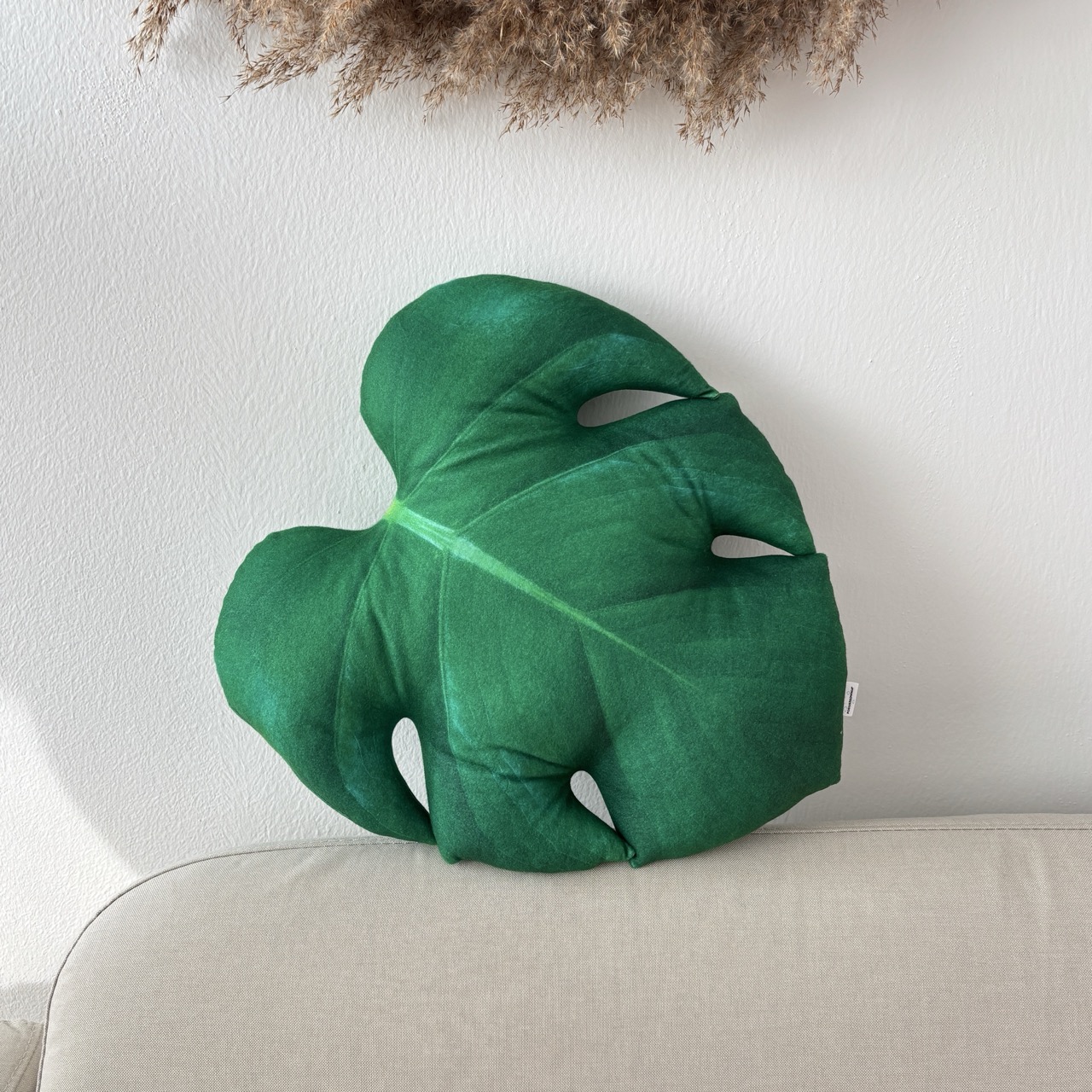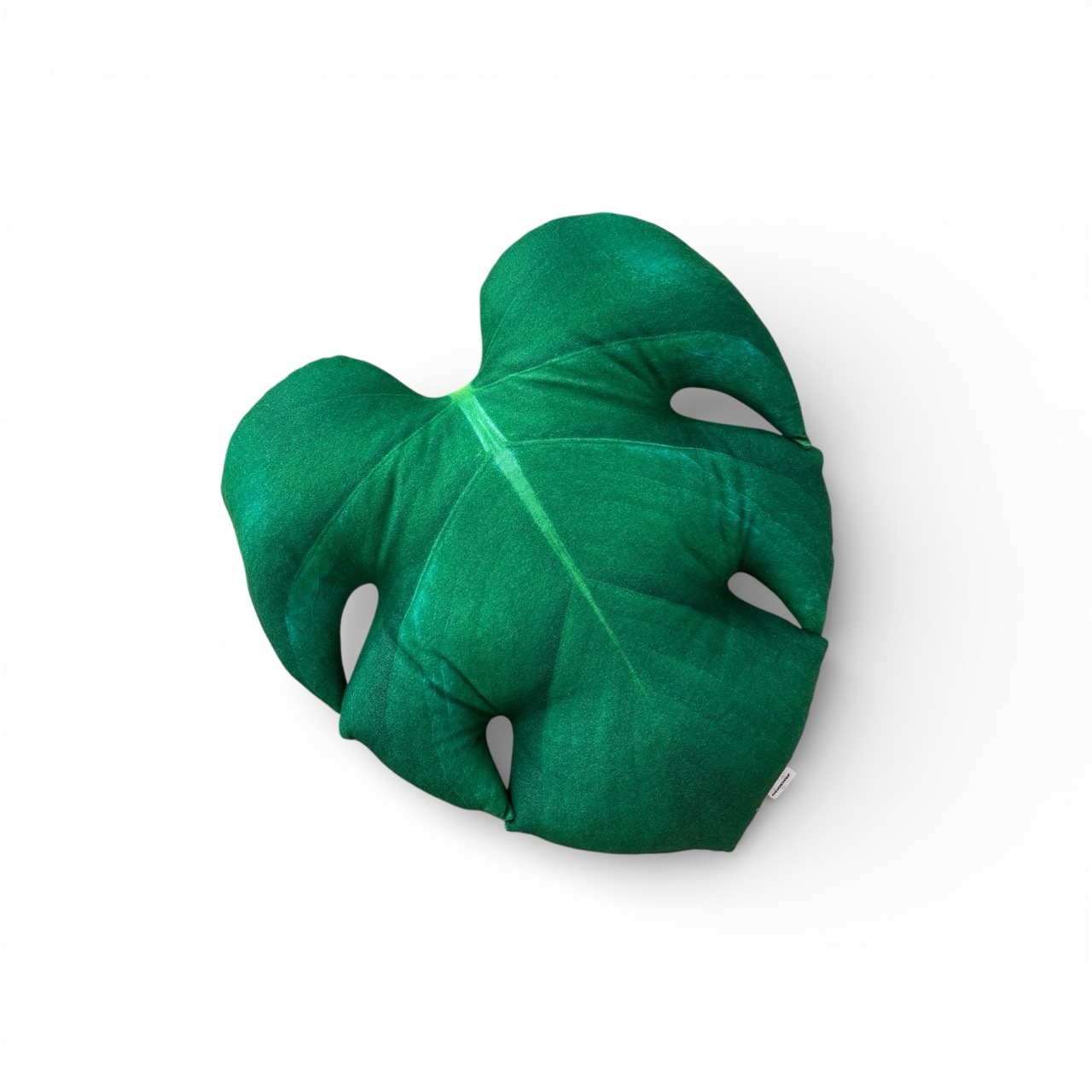 Poduszka w kształcie liścia Monstery w odmianie Deliciosa, przepiękna intensywna zieleń z detalami liścia tej wyjątkowej i popularnej rośliny ozdobnej.